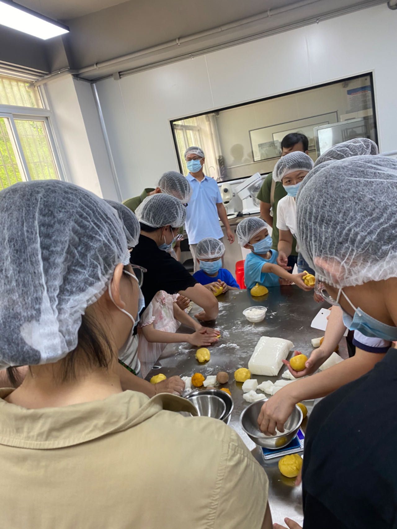 讲解结束后,大家带领着祖国的花朵们,开始分工合作,称材料、揉面团、分馅料、包饼皮、压膜成型。在专业老师的细心指导下,大家每个步骤都有条不紊,活动现场弥漫着轻松愉快的氛围。月饼制作好后,大家将其送入烤箱,等待着自己亲手制作的月饼新鲜出炉。