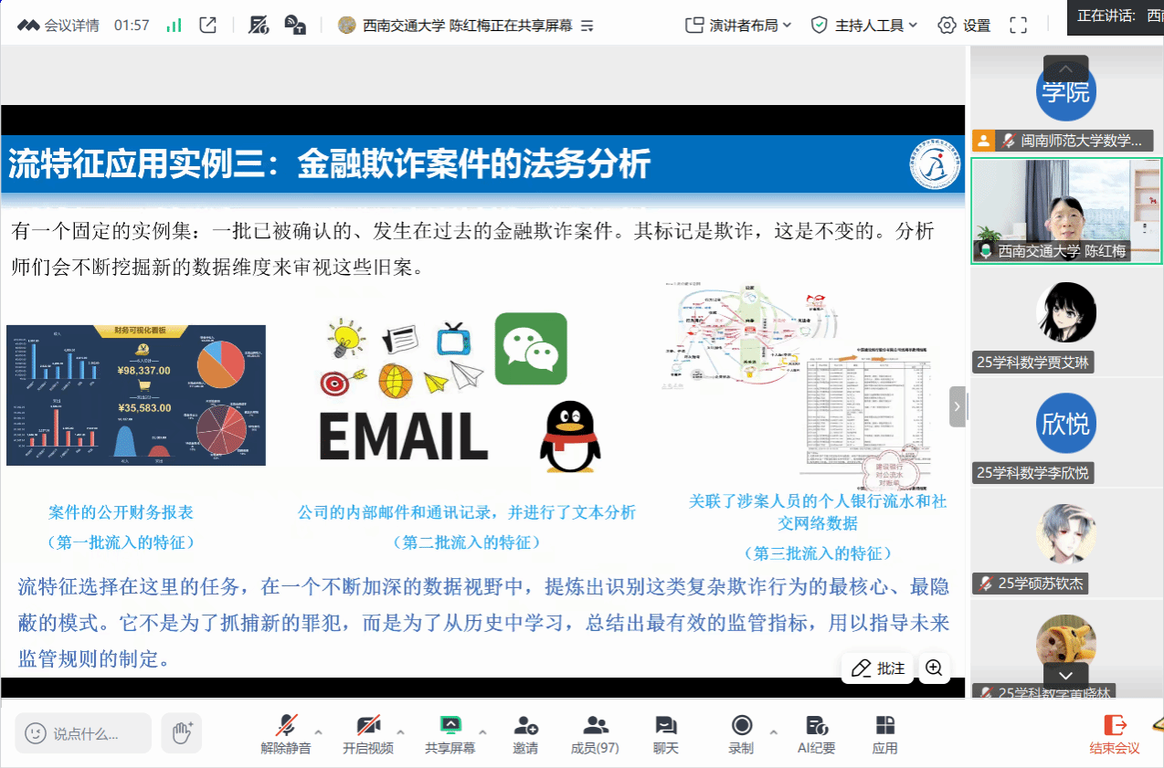 邀请,10月26日下午,西南交通大学陈红梅教授在腾讯会议作了题为《利用模糊流形类内相关性和类间可分性的在线多标签流特征分析》的讲座。相关师生聆听了此次讲座,讲座由廖淑娇老师主持。