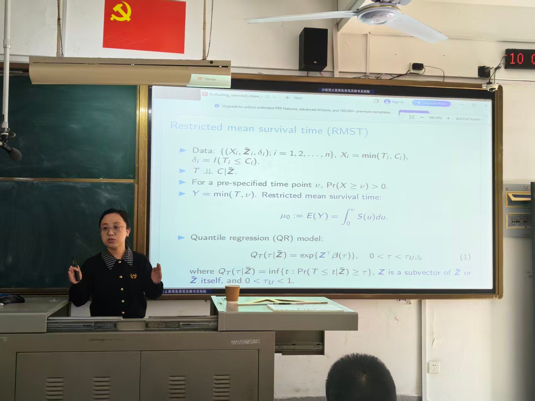 邀请,12月15日上午,华东师范大学马慧娟副教授在砺志楼302作了题为《From censored quantile regression to restricted mean survival time: estimation and prediction》的讲座。相关师生聆听了此次讲座,讲座由施建华老师主持。