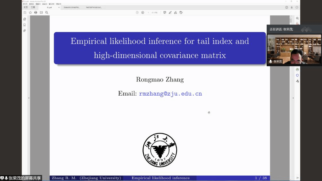 邀请,12月25日下午,浙江大学张荣茂教授在腾讯会议作了题为《Empirical likelihood inference in tail index andhigh-dimensionalcovariance matrix》的报告。相关师生聆听了此次报告,报告由施建华教授主持。