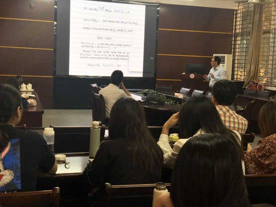 报告中,李波教授首先介绍了量子的相关概念以及背景,讲解了no-go理论的内容。然后,李波教授介绍了信息覆盖的确定性情形,阐述了通过非零线性算子进行信息覆盖的问题,非零线性算子不能覆盖任何量子状态的非零测度集,证明了Blochsphere上的最大可覆盖状态集是球形圆上的状态,为我们讲解了信息覆盖的完全策划。最后,李波教授讲解了非零测度量子状态集覆盖的不可能性。报告结束后,在座的师生就相关研究问题进行了探讨和交流。