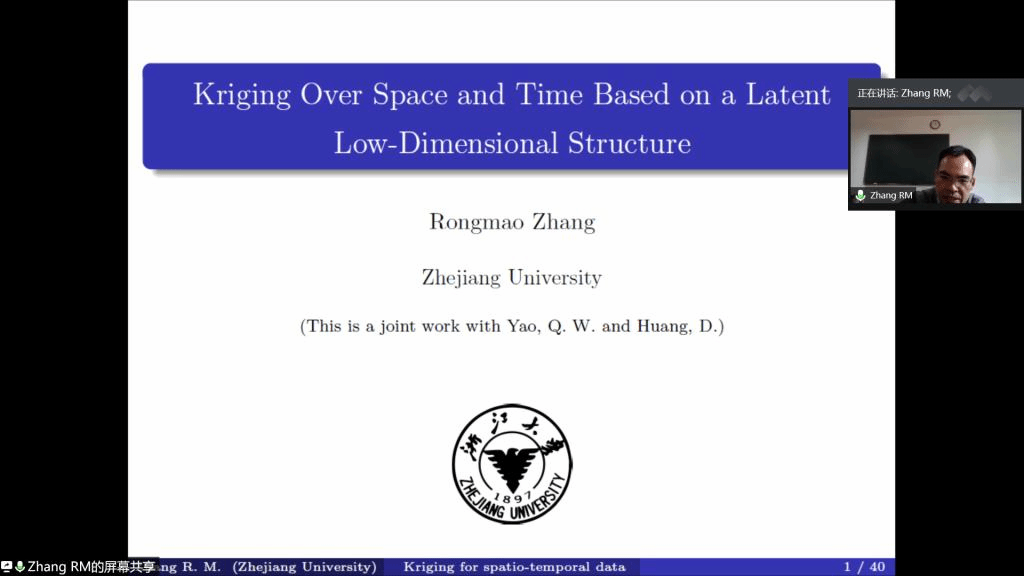 邀请,12月21日下午,浙江大学张荣茂教授在腾讯会议上作了题为《KrigingsOver Space and Time Based on a Latent Low-Dimensional Structure》的报告。相关师生聆听了此次报告,报告由施建华教授主持。