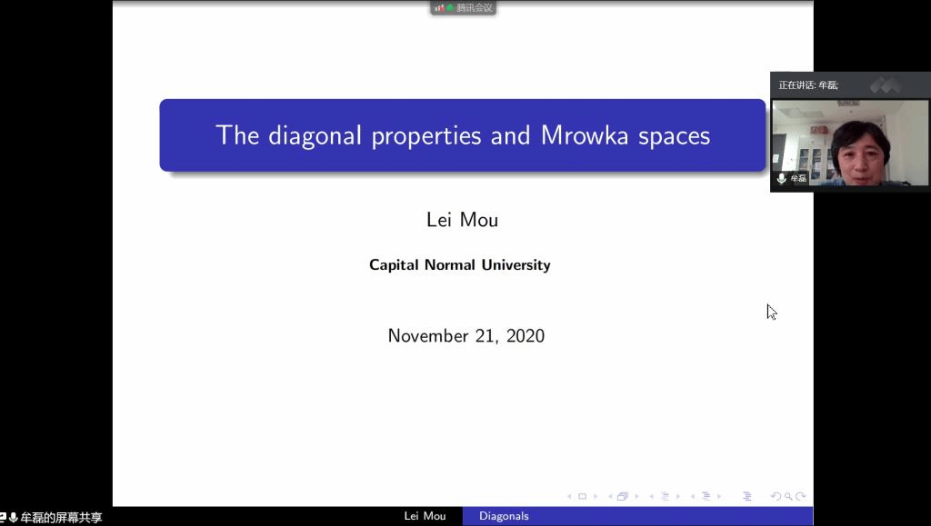 邀请,11月21日上午,首都师范大学牟磊教授在腾讯会议作了题为《The diagonal properties and Mrowka spaces》的报告。相关师生聆听了此次报告,报告由林福财教授主持。
