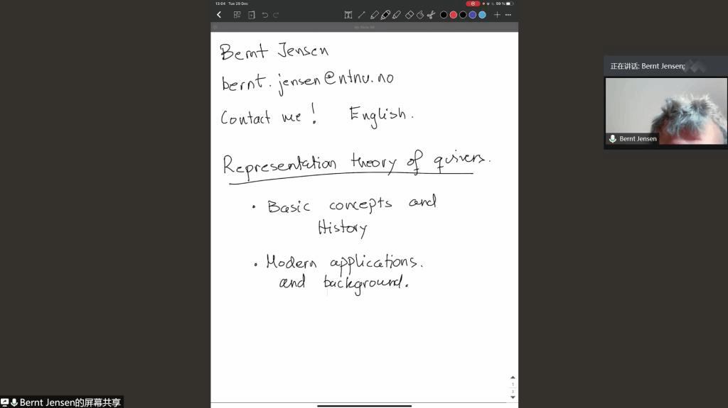 邀请,12月29日晚上和12月30日晚上,挪威科技大学Bernt Tore Jensen副教授在腾讯会议分别作了题为《Representation theory of quivers》和《Gabriel Theorem’Proof》的报告。相关师生聆听了此次报告,报告由黄菊博士主持。
