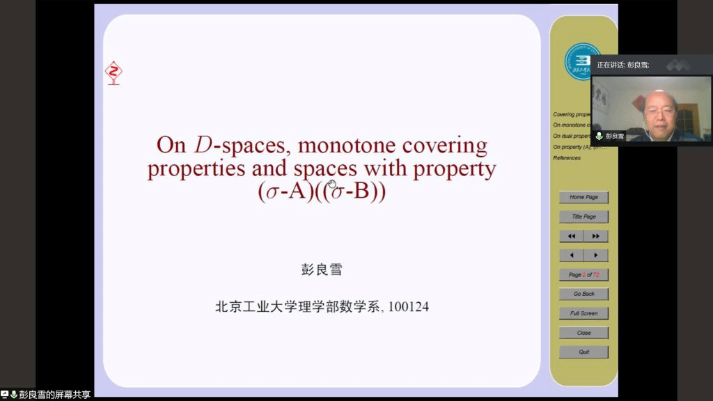 邀请,11月8日早上,北京工业大学彭良雪教授在腾讯会议作了题为《On D-spaces, monotone covering properties and spaces with property (σ-A) ((σ-B))》的报告。相关师生聆听了此次报告,报告由林福财教授主持。