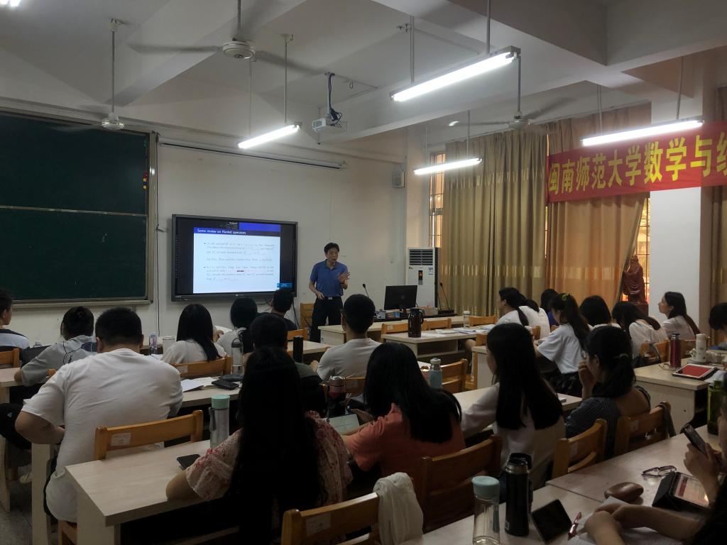 胡璋剑教授在砺志楼105作了题为《HANKEL OPERATORS ON STRONGLY PSEUDOCONVEX DOMAINS》的报告。相关师生聆听了此次报告,报告由李进金老师主持。