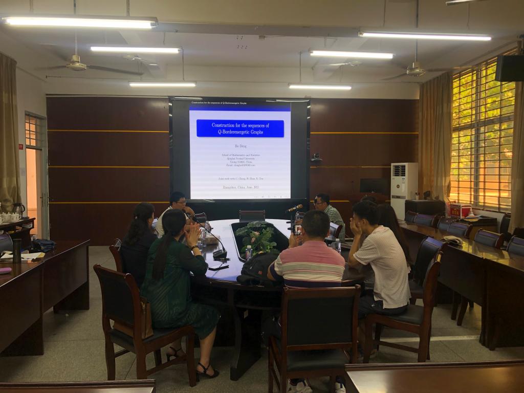 邀请,6月20日下午,青海师范大学邓波副教授在砺志楼114作了题为《Construction for the Sequences of Q-Borderenergetic Graphs》的报告。相关师生聆听了此次报告,报告由卢福良教授主持。