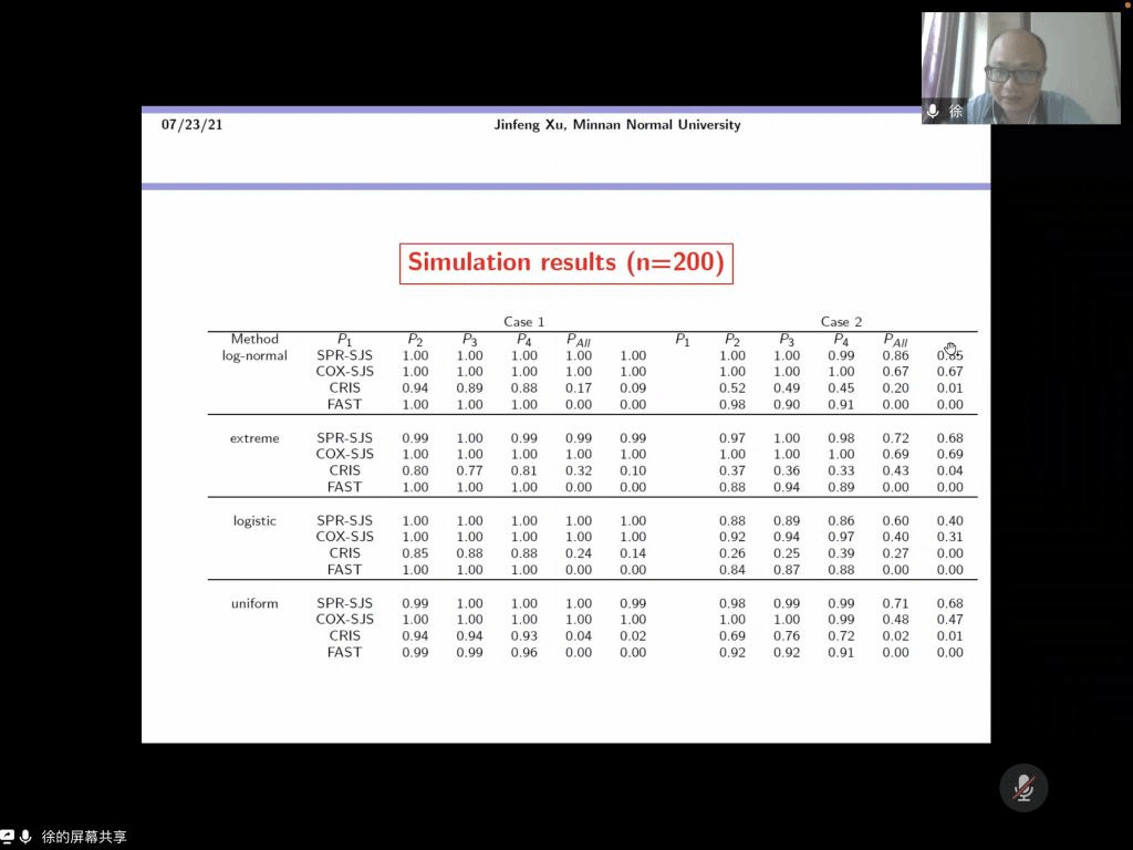 邀请,7月23日上午,香港大学徐锦峰教授在腾讯会议上作了主题为《Sure joint feature screening in nonparametric transformation model for right censored data》的报告。此次报告由施建华教授主持,相关师生聆听了此次报告。
