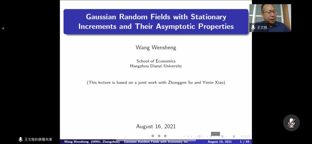 邀请,8月16日上午,杭州电子科技大学王文胜教授在腾讯会议上作了题为《具有平稳增量的高斯随机场及其轨道性质》的报告。此次报告由刘群老师主持,相关师生聆听了此次报告。