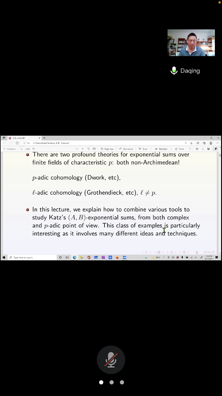 邀请,9月22日上午,美国加州大学欧文分校万大庆教授在腾讯会议作了题为《On Katz's (A,B)-exponential sums》的报告。相关师生聆听了此次报告,报告由曹炜教授主持。