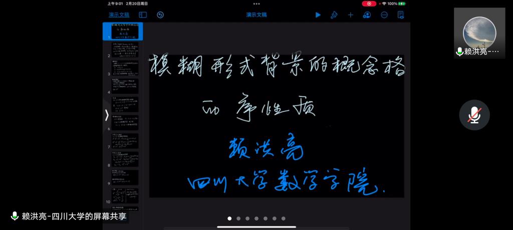 邀请,2月20日早上,四川大学赖洪亮教授在腾讯会议作了题为《模糊形式背景的概念格的序性质》的报告。相关师生聆听了此次报告,报告由李进金老师主持。