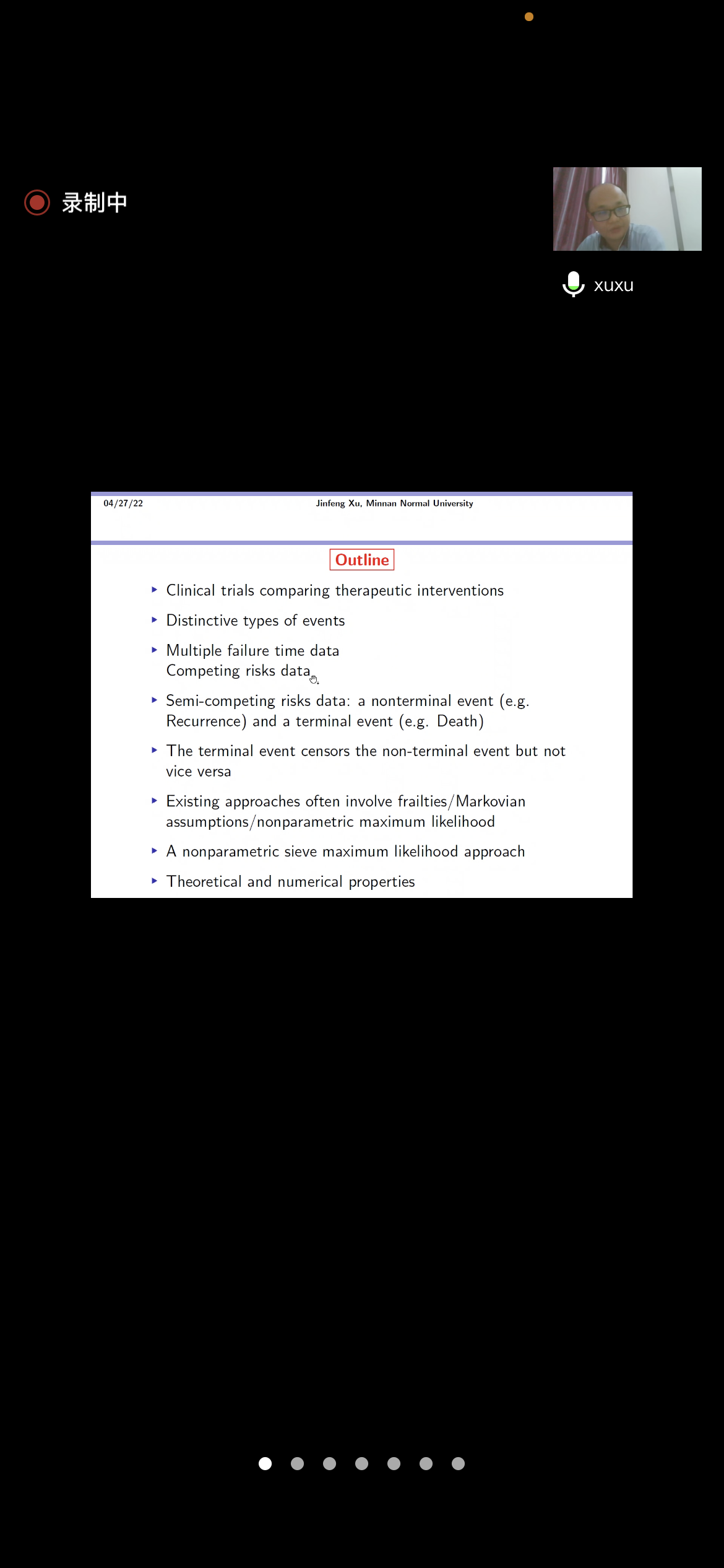 邀请,4月27日下午,香港大学徐锦峰教授在腾讯会议作了题为《Spline estimation of semi-competing risks data》的报告。相关师生聆听了此次报告,报告由施建华老师主持。
