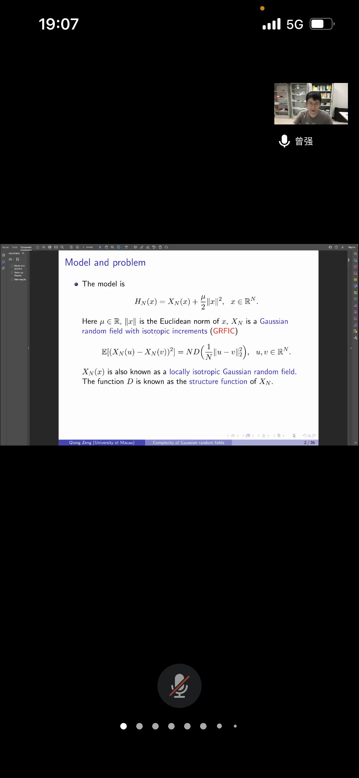 邀请,5月11日晚上,澳门大学曾强副教授在腾讯会议作了题为《Complexity of high dimensional Gaussian random fields with isotropic increments》的报告。相关师生聆听了此次报告,报告由刘群老师主持。