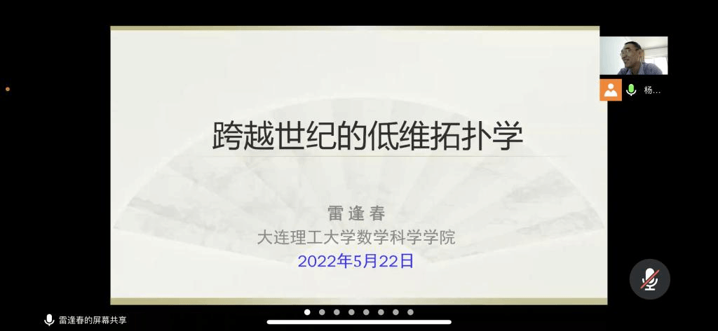 邀请,5月22日早上,大连理工大学雷逢春教授在腾讯会议作了题为《跨世纪的低维拓扑学》的报告。相关师生聆听了此次报告,报告由杨忠强老师主持。