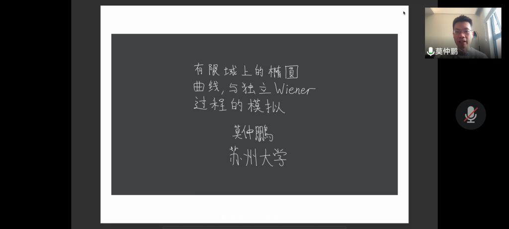邀请,5月27日下午,苏州大学莫仲鹏教授在腾讯会议作了题为《有限域上的椭圆曲线,与高维随机向量的模拟》的报告。相关师生聆听了此次报告,报告由曹炜老师主持。