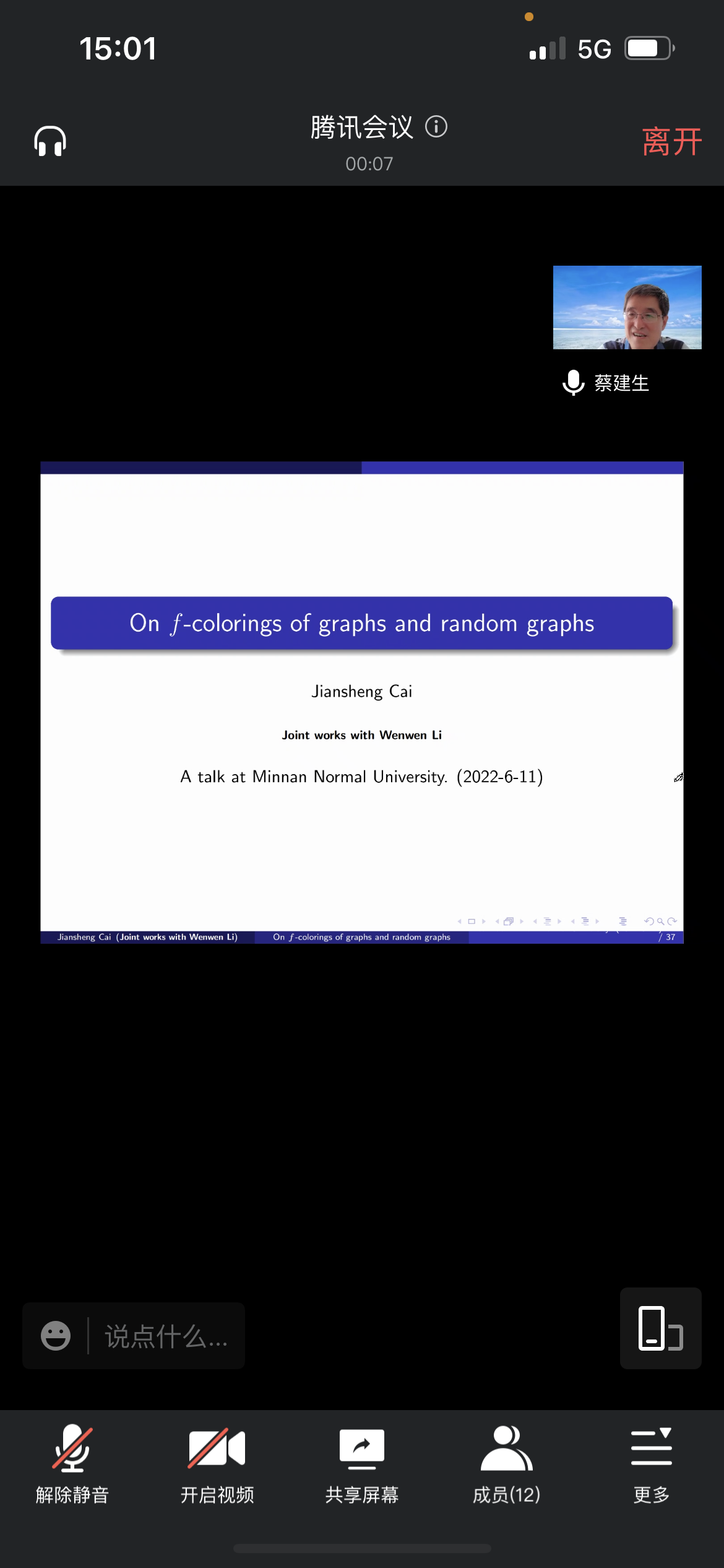 蔡建生教授在腾讯会议作了题为《On f-colorings of graphs and random graphs》的报告。相关师生聆听了此次报告,报告由卢福良老师主持。