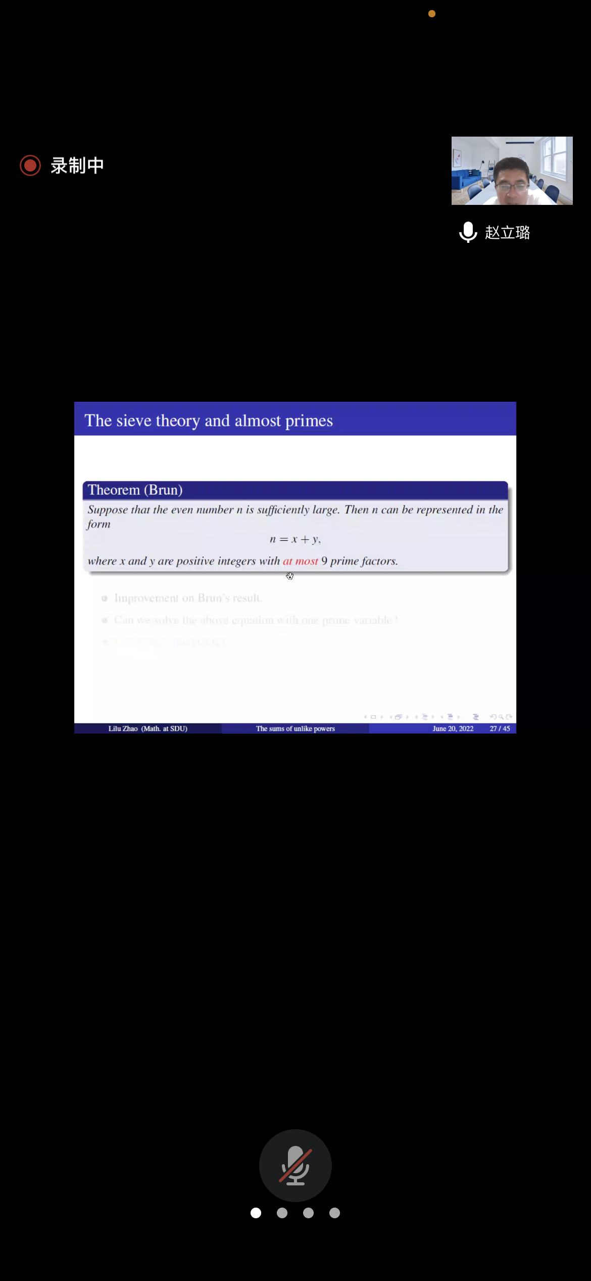 邀请,6月20日晚上,山东大学赵立璐教授在腾讯会议作了题为《The sums of unlike powers》的报告。相关师生聆听了此次报告,报告由曹炜老师主持。