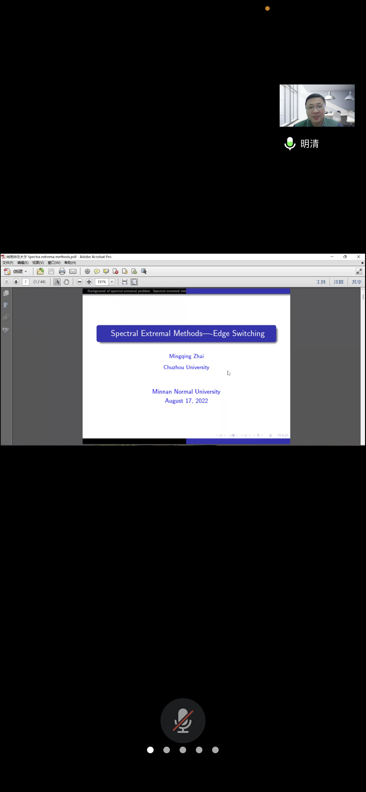 翟明清教授在腾讯会议作了题为《Spectral extremal methods—Edge switching》的报告。相关师生聆听了此次报告,报告由李建喜老师主持。