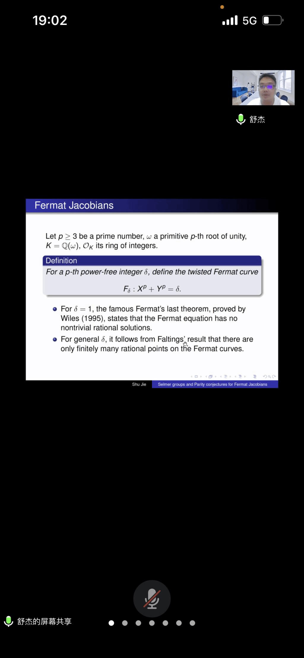 邀请,8月31日晚上,同济大学舒杰副教授在腾讯会议作了题为《Selmer groups and parity conjectures for Fermat Jacobians》的报告。相关师生聆听了此次报告,报告由曹炜老师主持。
