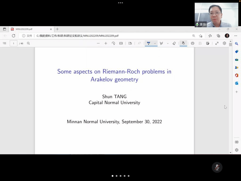 邀请,9月30日下午,首都师范大学唐舜教授在腾讯会议作了题为《Arakelov几何中的Riemann-Roch问题》的报告。相关师生聆听了此次报告,报告由曹炜老师主持。