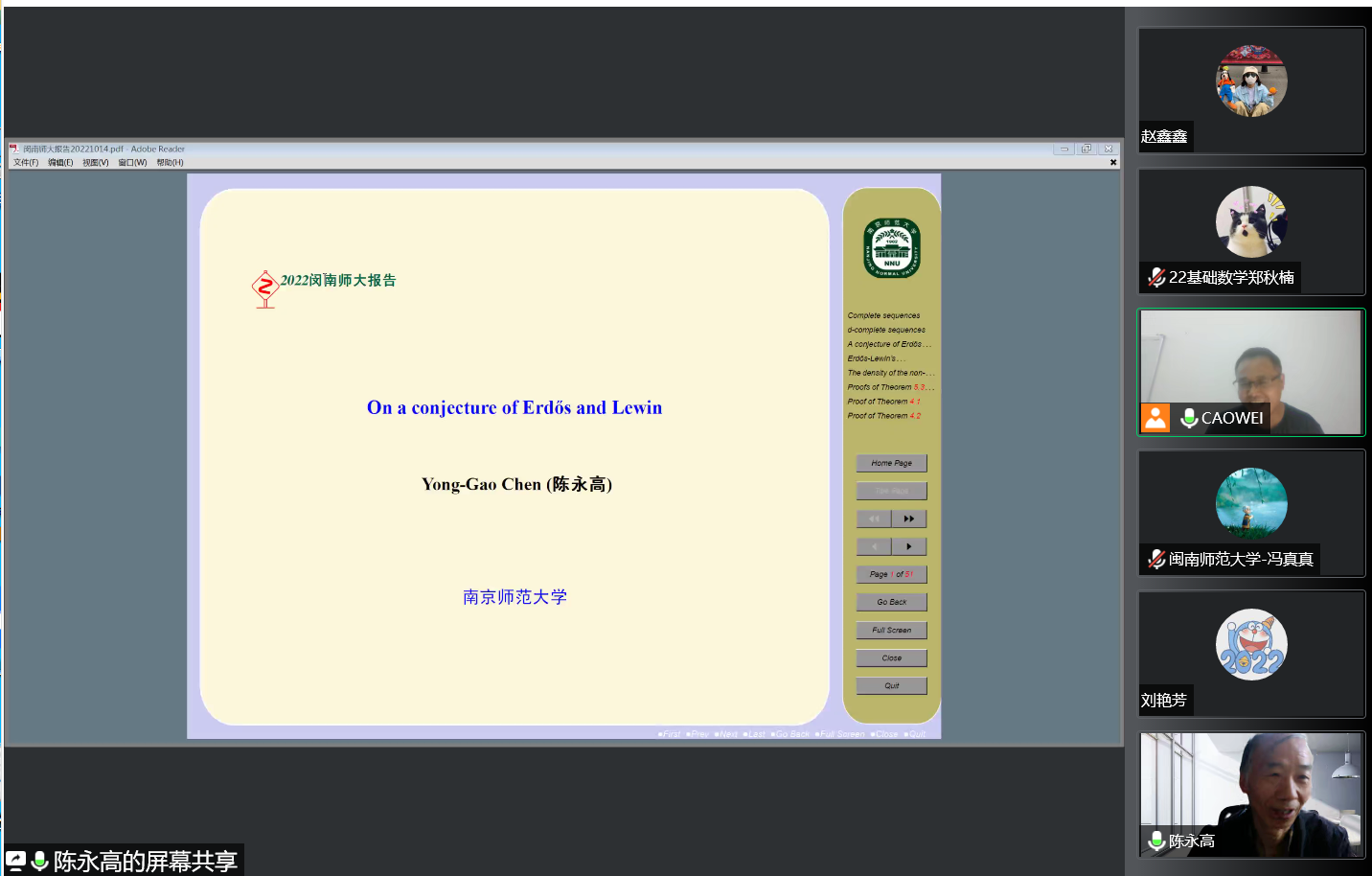 邀请,10月14日下午,南京师范大学陈永高教授在腾讯会议作了题为《On a conjecture of Erdos and Lewin》的报告。相关师生聆听了此次报告,报告由曹炜老师主持。