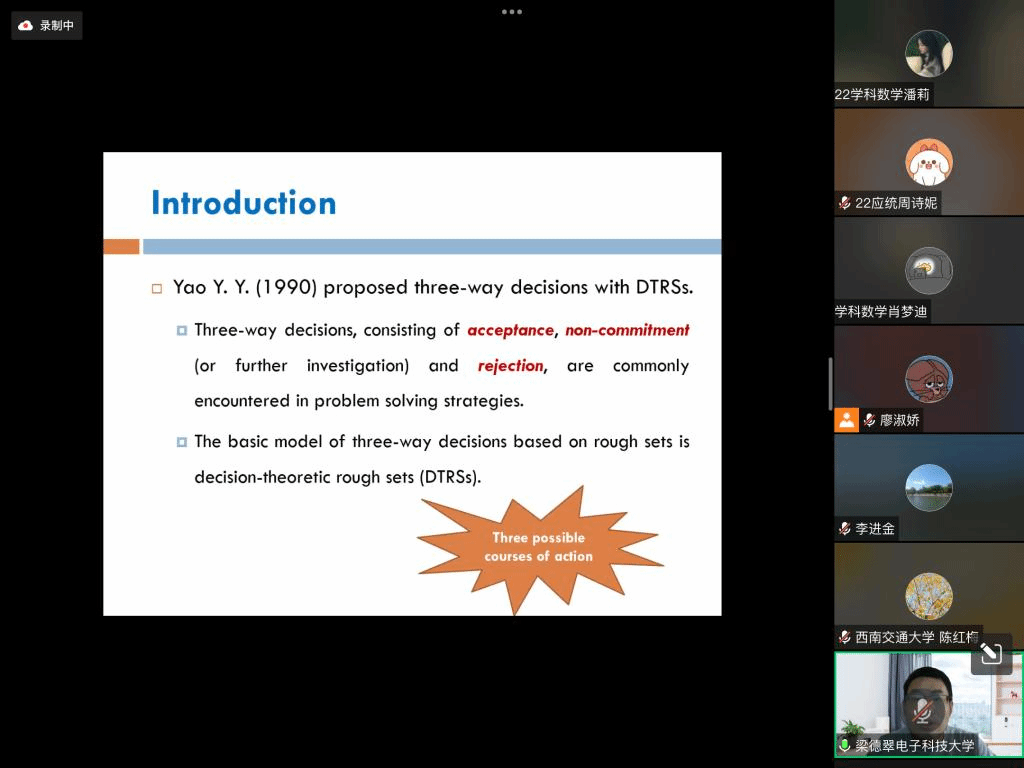 邀请,10月18日下午,电子科技大学梁德翠教授在腾讯会议作了题为《三支决策中的偏好学习与共识机制研究》的报告。相关师生聆听了此次报告,报告由廖淑娇老师主持。