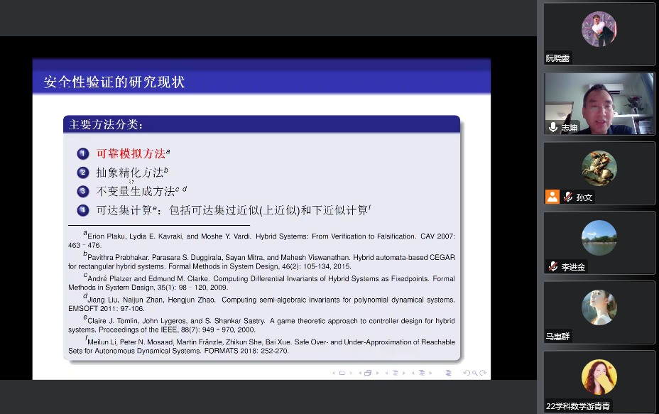 邀请,10月25日下午,北京航空航天大学佘志坤教授在腾讯会议作了题为《基于可达集上下近似的混成系统安全性验证研究》的报告。相关师生聆听了此次报告,报告由李进金老师主持。