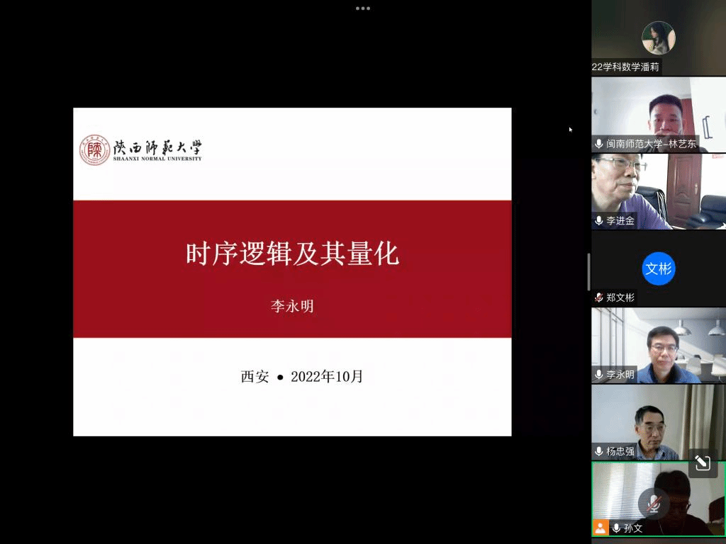 邀请,10月29日上午,陕西师范大学李永明教授在腾讯会议作了题为《时序逻辑及其量化》的报告。相关师生聆听了此次报告,报告由孙文老师主持。
