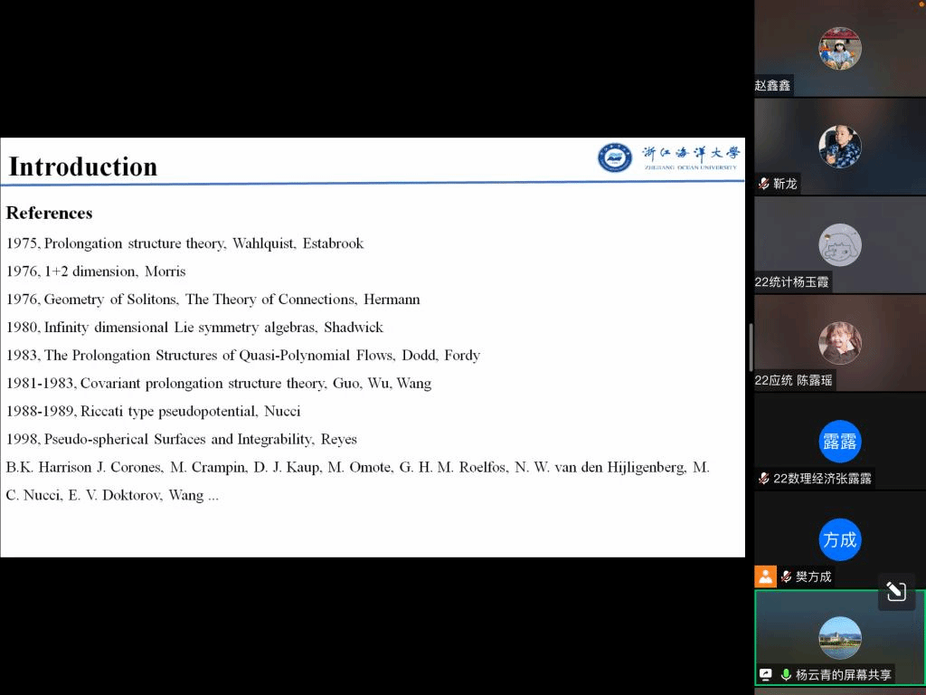 邀请,11月16日晚上,浙江海洋大学杨云青教授在腾讯会议作了题为《Pseudopotentials and Nonlinear Waves》的报告。相关师生聆听了此次报告,报告由樊方成老师主持。