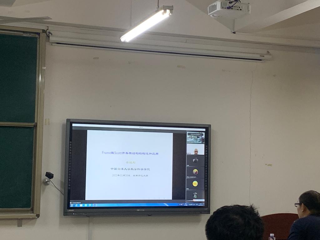 邀请,11月18日下午,中国海洋大学岳跃利教授在腾讯会议作了题为《Frame值Scott开集模结构的构造与应用》的报告。相关师生聆听了此次报告,报告由黄韩亮老师主持。