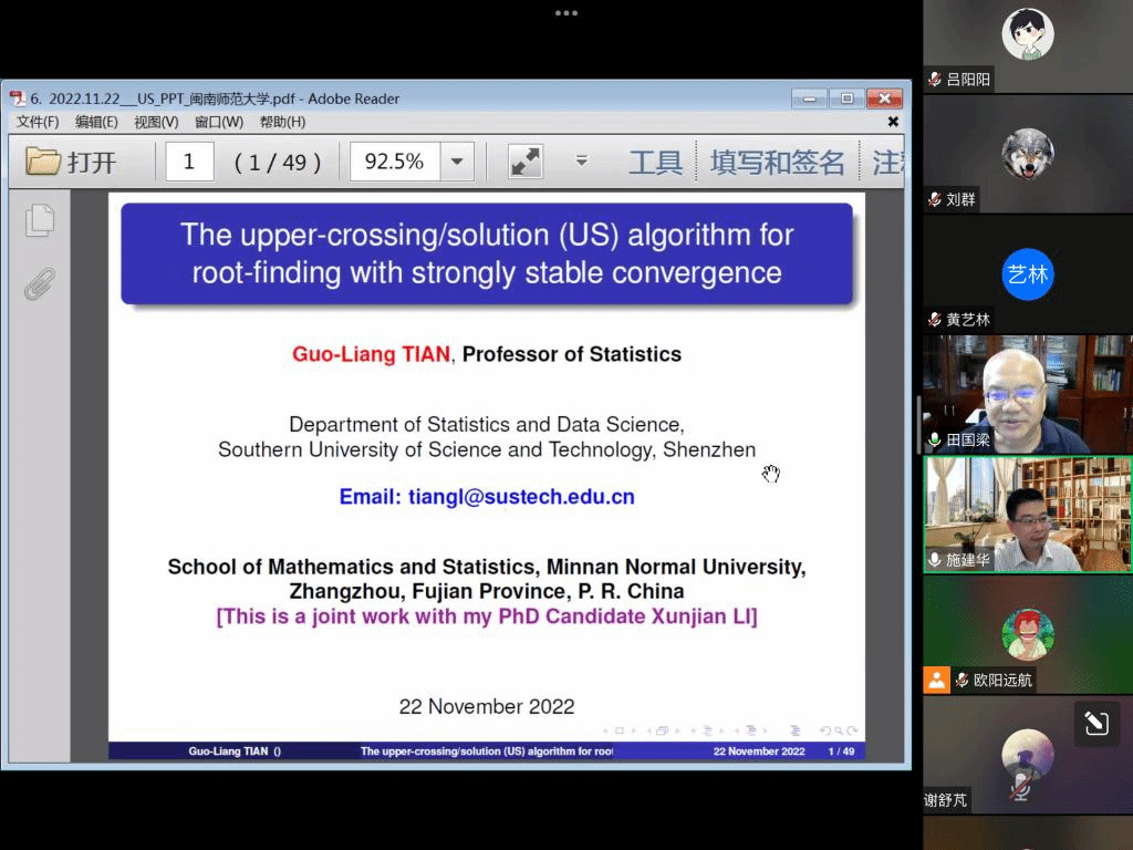 邀请,11月22日下午,南方科技大学田国梁教授在腾讯会议作了题为《The upper-crossing/solution (US) algorithm for root-finding with strongly stable convergence》的报告。相关师生聆听了此次报告,报告由施建华老师主持。