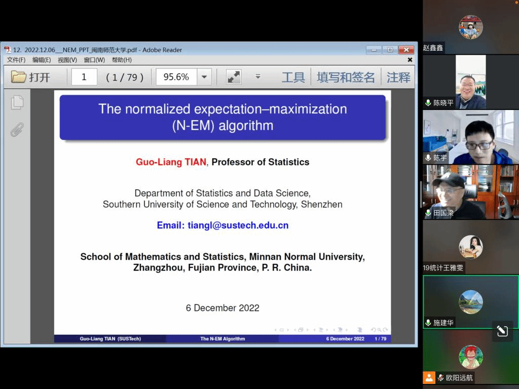 邀请,12月6日下午,南方科技大学田国梁教授在腾讯会议作了题为《The normalized expectation-maximization (N-EM) algorithm》的报告。相关师生聆听了此次报告,报告由陈宇老师主持。
