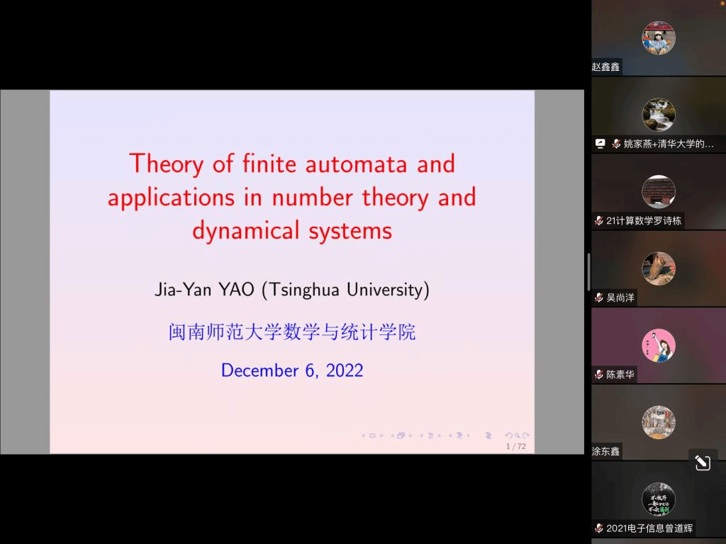 邀请,12月6日下午,清华大学姚家燕教授在腾讯会议作了题为《有限自动机理论及其在数论与动力系统中应用》的报告。相关师生聆听了此次报告,报告由曹炜老师主持。