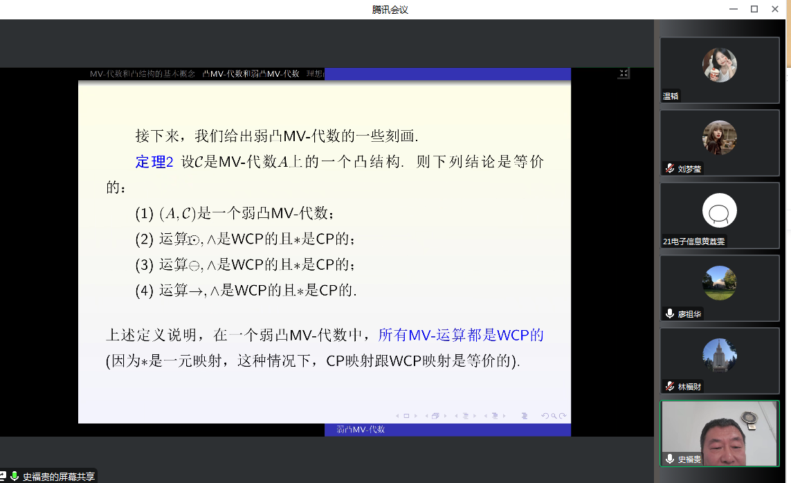 邀请,3月4日早上,北京理工大学史福贵教授在腾讯会议作了题为《弱凸MV-代数》的报告。相关师生聆听了此次报告,报告由林福财老师主持。