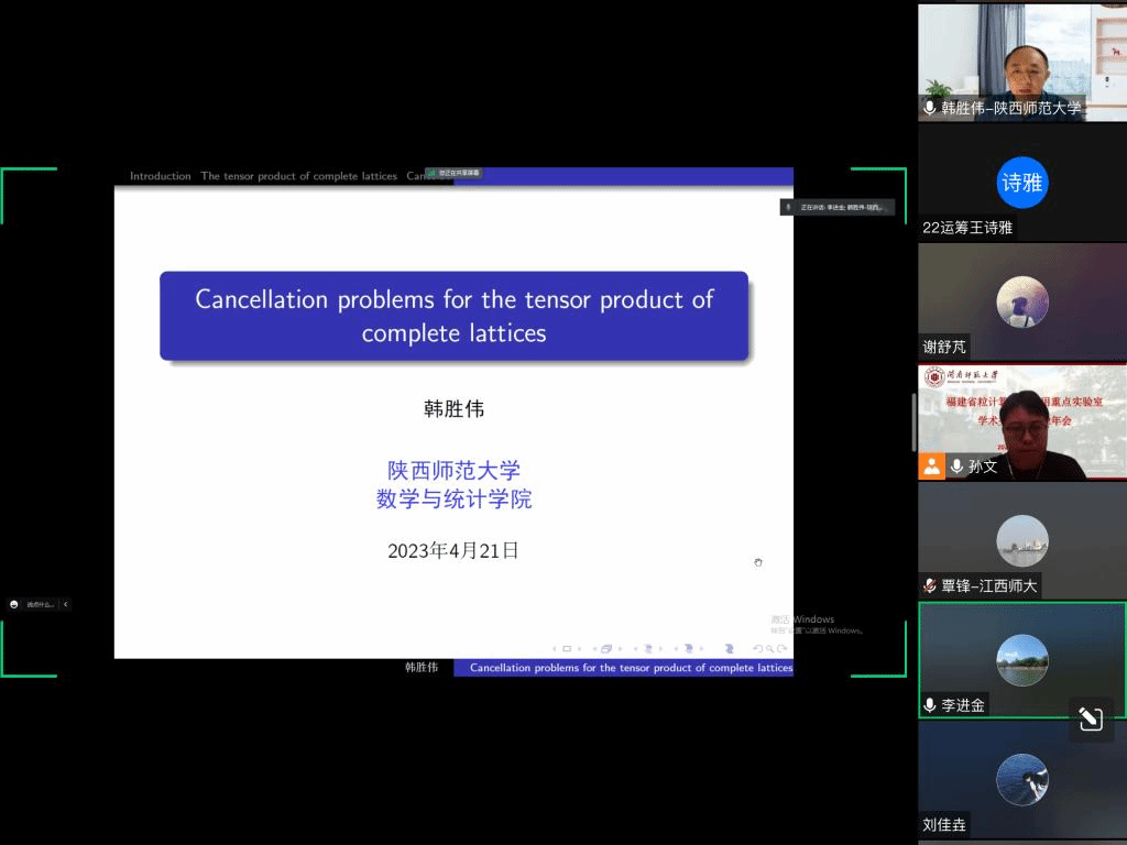 邀请,4月21日下午,陕西师范大学韩胜伟教授在腾讯会议作了题为《Cancellation problems for the tensor product of complete lattices》的报告。相关师生聆听了此次报告,报告由孙文老师主持。