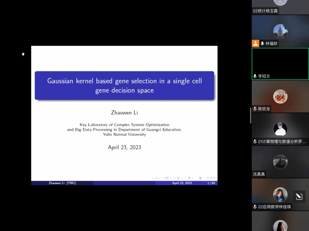 李招文教授在腾讯会议作了题为《单细胞基因决策空间基于高斯核的基因选择》的报告。相关师生聆听了此次报告,报告由林福财老师主持。