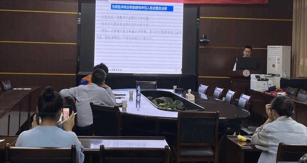 邀请,4月24日下午,河南理工大学智慧来副教授在砺志楼114作了题为《基于形式概念分析的冲突分析》的报告。相关师生聆听了此次报告,报告由孙文老师主持。
