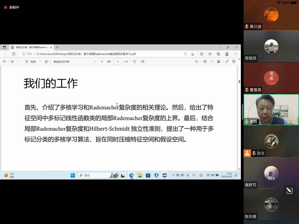 邀请,4月25日下午,华北电力大学陈德刚教授在腾讯会议作了题为《基于局部拉德马赫复杂度的多核学习》的报告。相关师生聆听了此次报告,报告由孙文老师主持。