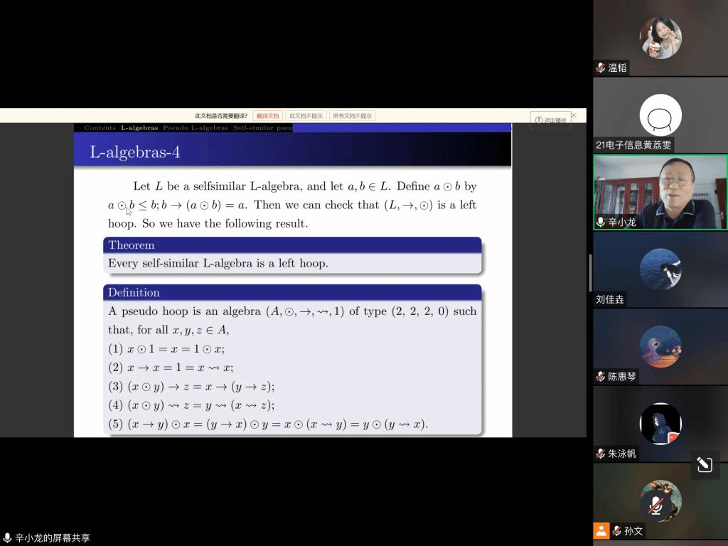 邀请,5月18日下午,西北大学辛小龙教授在腾讯会议作了题为《The unified model of quantum logic and fuzzy logic-pseudo L-algebras》的报告。相关师生聆听了此次报告,报告由李进金老师主持。