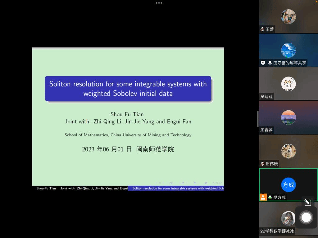 邀请,5月31日晚上,中国矿业大学田守富教授在腾讯会议作了题为《Soliton resolution for some integrable systems》的报告。相关师生聆听了此次报告,报告由樊方成老师主持。