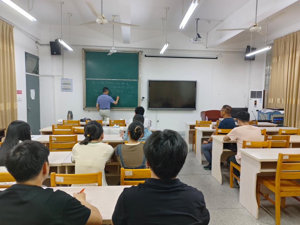 报告中,万大庆教授首先讲解有限域上的经典n-变量Kloosterman和Deligne定理从复数的观点和Sperber定理从p-adic的观点都是很好地理解。其所谓倒N-变量Kloosterman和是N.Katz(1995)在Ramanujan图的新构造的推动下提出的。在这篇文章中,我们从复数和p-adic的观点解释了在高维情形下可以证明的东西。正如我们将要看到的,倒n-变量Kloosterman和在所有方面都比经典n-变量Kloosterman和复杂,因为我们的理解不那么完整,部分原因是霍奇数现在大多是2,而不是1。这是和Xin Lin的联合工作。报告结束后,在座的师生就相关研究问题进行了探讨和交流。