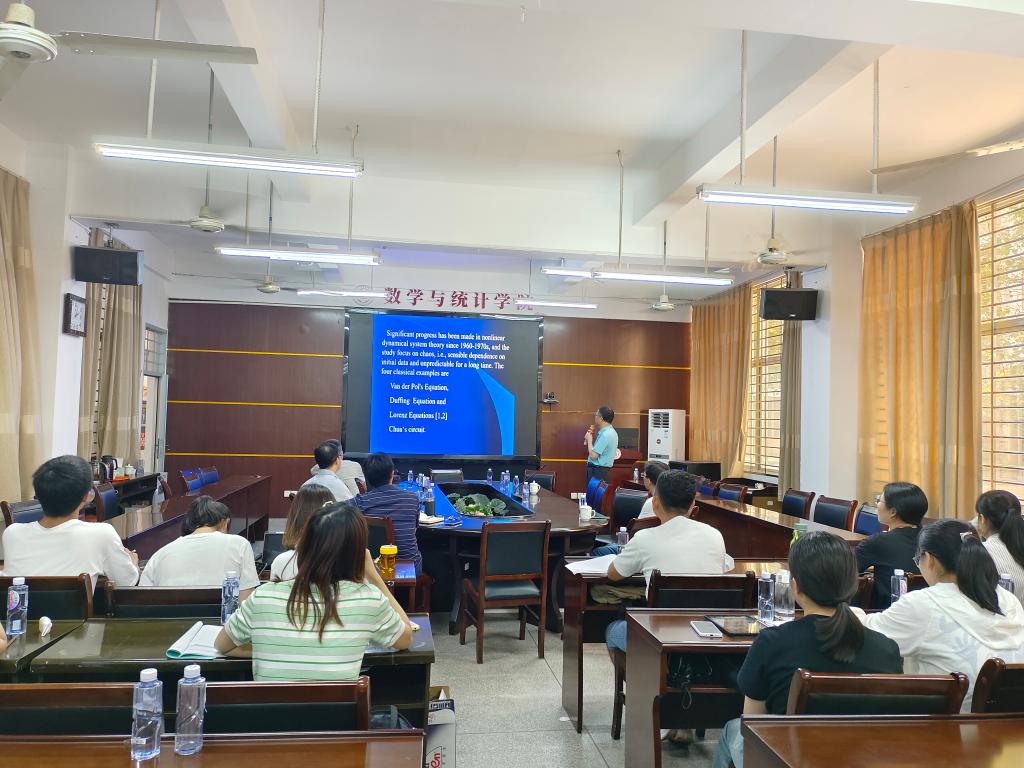邀请,6月2日下午,华南理工大学杨启贵教授在励志楼114作了题为《Chaotic vibrations of 3Dlinear hyperbolic PDEs》的报告。相关师生聆听了此次报告,报告由吴晓锋老师主持。