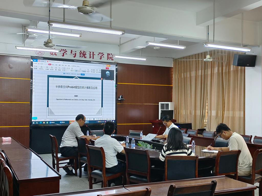 邀请,6月20日下午,美国圣地亚哥州立大学陈建伟教授在励志楼114作了题为《半参数空间Probit模型的统计推断及应用》的报告。相关师生聆听了此次报告,报告由黄韩亮老师主持。