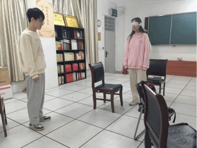 蒙上双眼,喧嚣归于沉寂。视线被遮蔽,脚步徘徊时,伙伴的清晰指引便是前行的底气。这就是「周四解忧局」里的“盲眼小向导”游戏:两人一组,“盲人”摸索探路,“向导”语言护航,全程无肢体接触,凭信任与默契携手绕过障碍,在协作中读懂陪伴的重量。