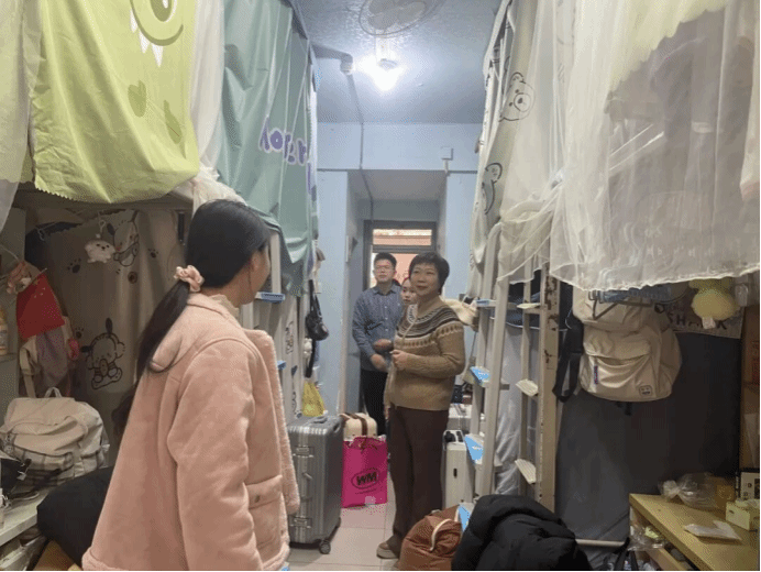 领导一行还深入学生宿舍,细致查看门窗、水电及消防设备现状,亲切询问学生返校情况与生活需求,叮嘱注意用电安全、保持宿舍整洁。陈晶莹书记强调,宿舍检查是开学工作的重要环节,要求辅导员秉持学生至上原则,强化责任担当,抓实抓细各项工作,全力打造温馨安全、让学生安心、家长宽心的住宿环境,助力同学们以饱满状态投入新学期的学习生活。
