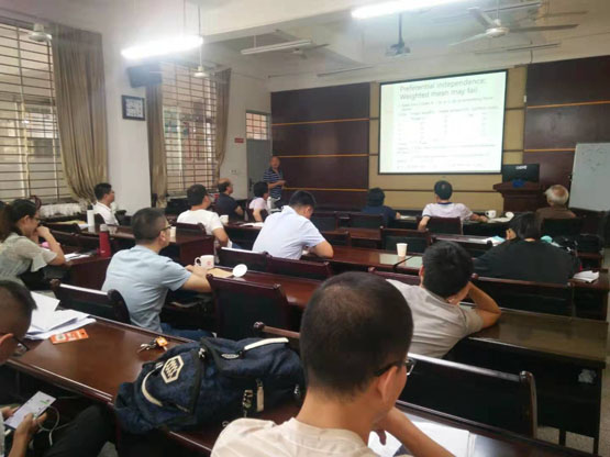 在报告中,美国北卡罗莱纳大学彭布罗分校卫国教授首先详细介绍了一些基本概念,如凸对策等等;其次讲述了一些重要方法,如Mobius变换和Choquet积分;然后向我们介绍了在不确定性研究中常用的几种重要理论,包括Choquet容量和积分、Dempster-Shafer证据/信念函数理论、不确定性理论、模糊集合论、邓-刘灰色系统理论和粗糙集理论。最后卫国教授阐述了这些理论之间的关系。报告结束后,在座的老师和学生就相关研究问题进行了探讨和交流。