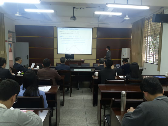 松永秀章教授在报告中,首先阐述了时滞微分方程,并推荐了几本关于时滞微分方程的书籍,然后用计算机模拟出其图像,同时介绍它的渐近稳定性;然后讲述了线性时滞微分方程的渐近稳定性与振动性;接着介绍线性时滞差分方程的渐近稳定性与振动性。结束后,在座的老师和学生就相关问题进行了探讨。