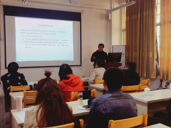 在报告中,沈建和教授首先用肿瘤模型介绍了冲击波解;其次介绍奇异摄动理论及其应用条件;然后用“鸭”理论讲解了折曲线上奇异性消除的方法。报告结束后,在座的老师和学生就相关研究问题进行了探讨和交流。