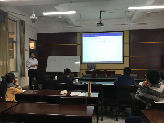 在报告中,曹继岭教授主要介绍了三个方面的内容:首先,介绍了函数ω(f,x)在点上的振荡的下确界就是函数在这点上的振荡,并得出当且仅当ω(f,x)=0时,函数在x上连续。同时,以拓扑正弦曲线为例,ω(f,x)虽有上半连性,但无法使ω(f,x)变成连续的函数。其次,说明了Ω(f,A)在集合上的振荡。最后,证明了映射A→ Ω(f,A)的连续性并介绍了UC集合这一概念。通过曹教授深入浅出的介绍,在场的老师和学生对数理经济的内容有了更进一步地了解。报告结束后,在场的老师和学生就相关研究问题进行了探讨和交流。