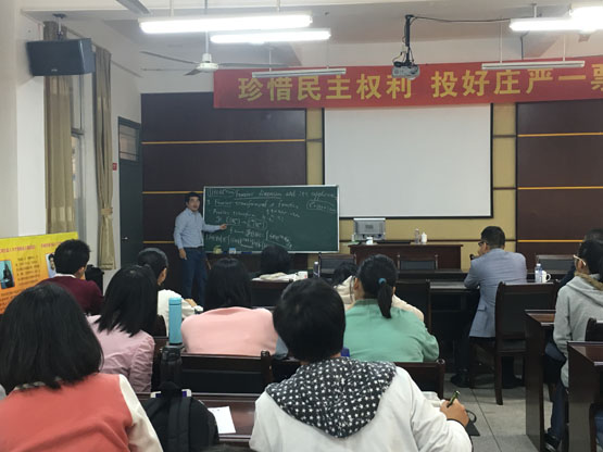 测度的傅里叶变换和傅里叶维数是研究分形集合及其他集合测度论中集合的强有力的一个工具。在《Fourier dimension and its applications》的报告中,李兵教授介绍了傅里叶维数的应用:距离集猜想、贝努利卷积与Besicovitch集等,同时也介绍了确定和随机情形的Salem集。通过李兵教授的介绍,大家对傅里叶变换有了更进一步的了解。报告结束后,在座的老师和学生就相关研究问题进行了探讨和交流。